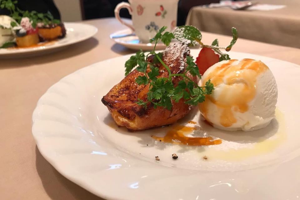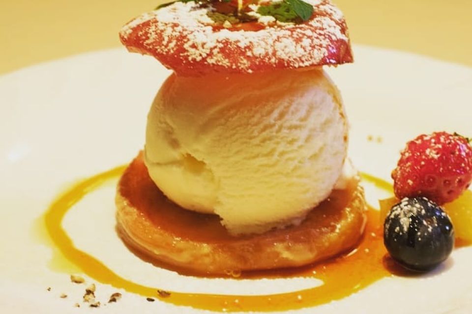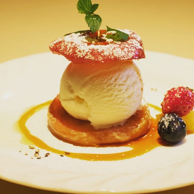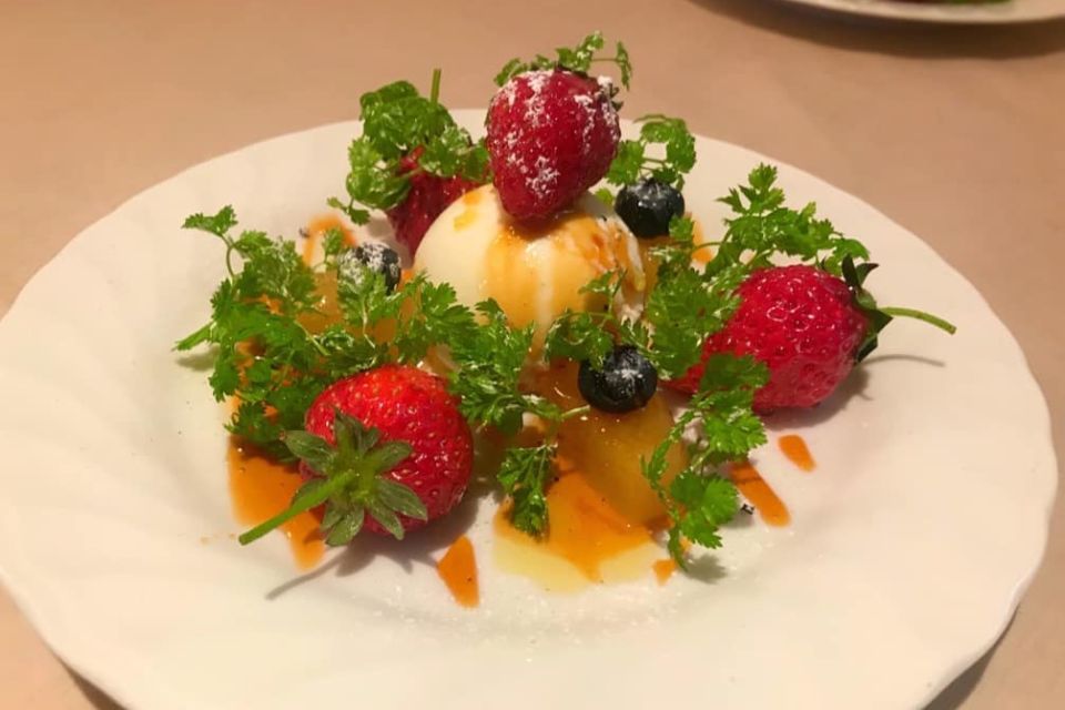 【苺のサラダ仕立て バニラアイスクリーム添え】 茨城産・バインバリー完熟苺をサラダ仕立てに。良質なオリーブオイルとカラメルソースをまとった一皿。