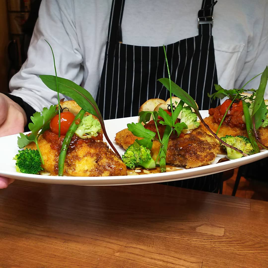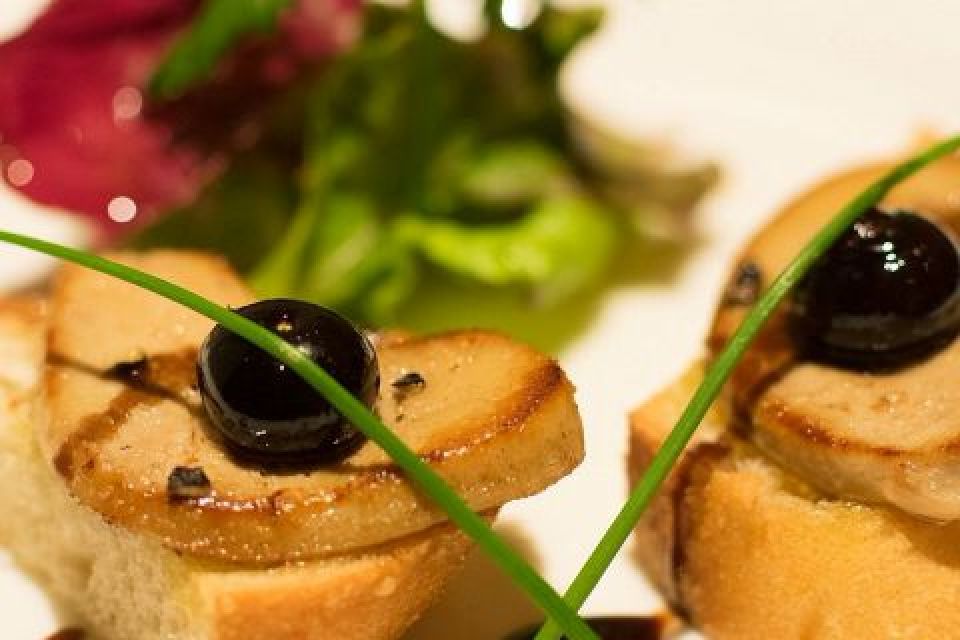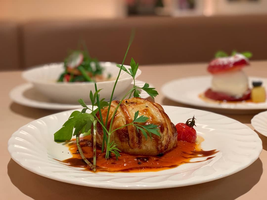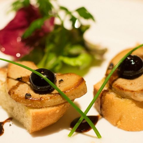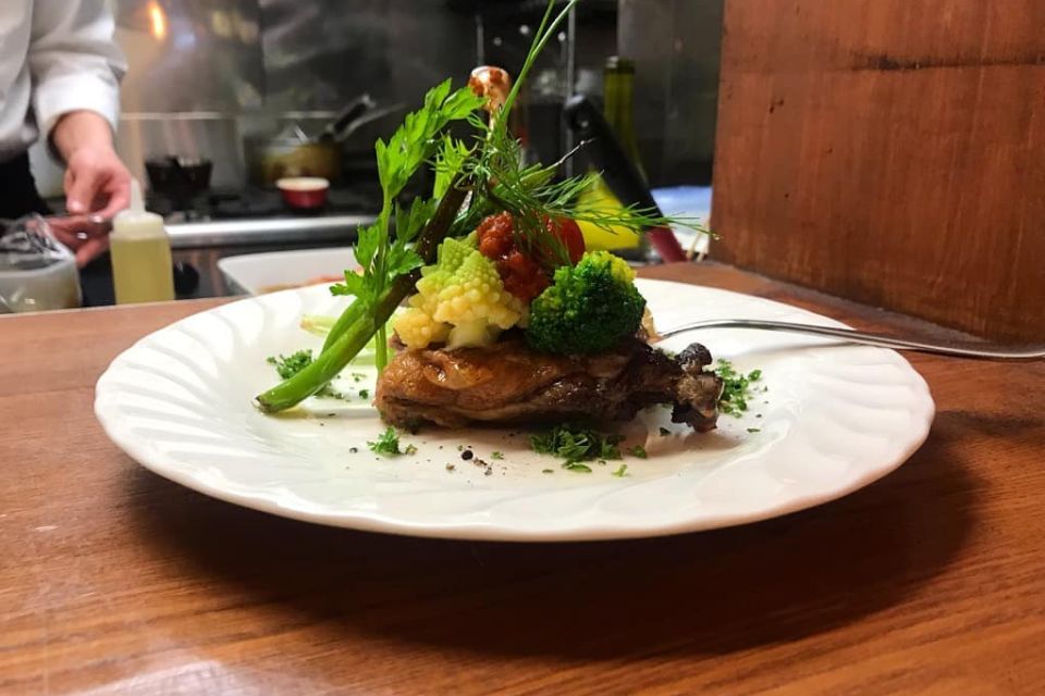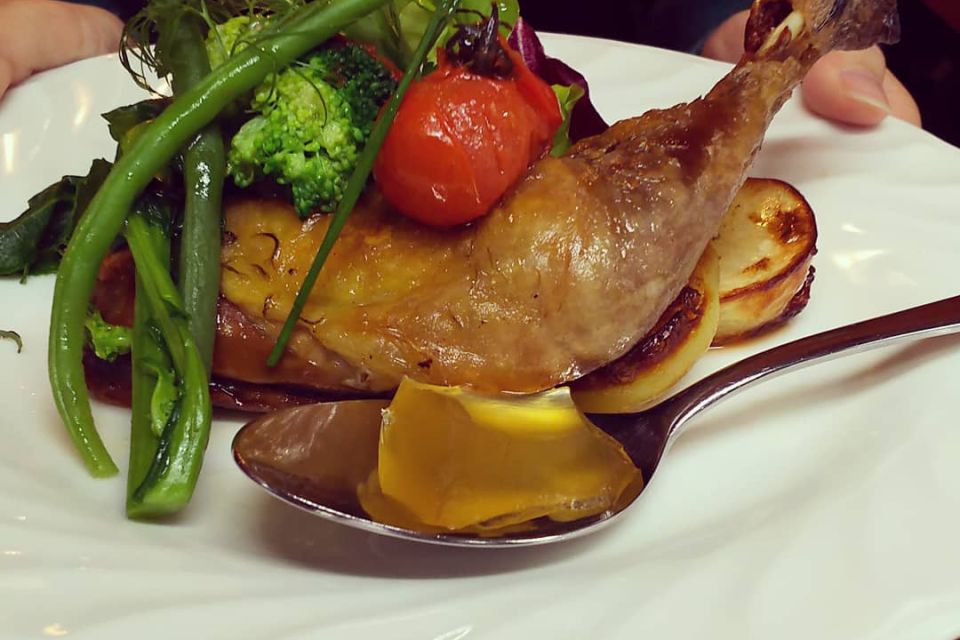 【鴨のモモ肉のコンフイ・野菜と鴨のジュレ添え】 香草と岩塩でマリネした鴨肉を、コクのある油でじっくり加熱・熟成。パリっと焼きあげる皮と、SHELLYのきいたジュレのハーモニー。